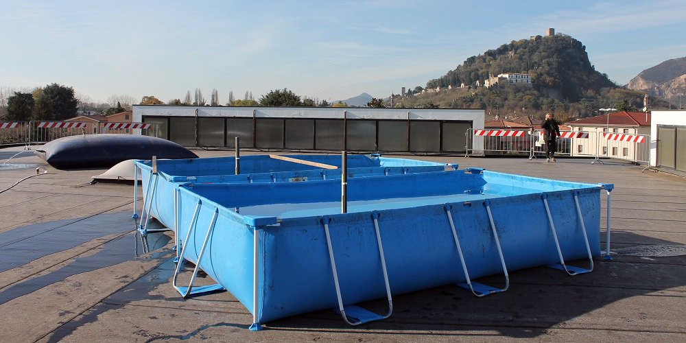 La struttura è stata sollecitata utilizzando un serbatoio flessibile di superficie 16 m2 e due piscine di superficie totale 16 m2. Il serbatoio e le due piscine sono state posizionate su una delle due capriate diagonali del quadrante centrale. La deformazione massima in mezzeria è stato di 7,6 mm.